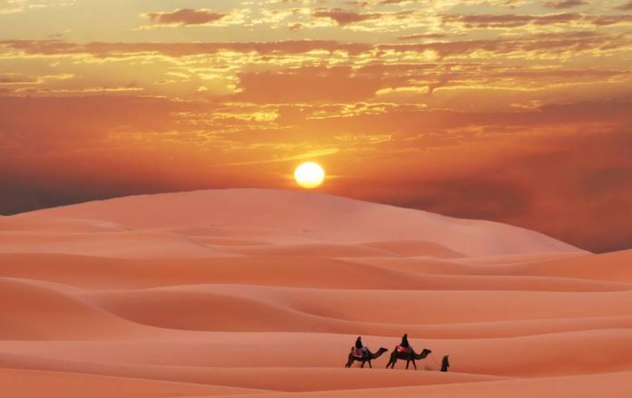 没有人会见过比撒哈拉沙漠更美的日出,凌晨的撒哈拉温度适中,找一个高一点的沙丘坐下,等待着一轮朝阳跳出地平线,光芒霎时铺满大地,给撒哈拉黄色的沙硕又镀上一层金色的光辉。