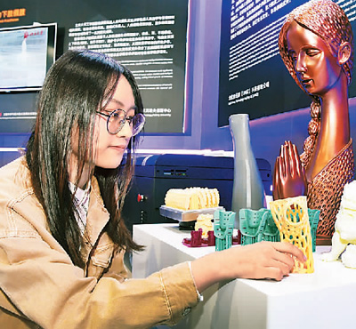 参观者在欣赏超高速光固化3D打印作品。 新华社发