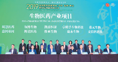 2019年峰会上,生物医药产业项目签约现场。(杭州市侨联供图)