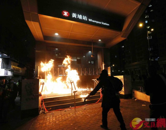 暴徒在港铁黄埔站纵火。(图源:文汇网)