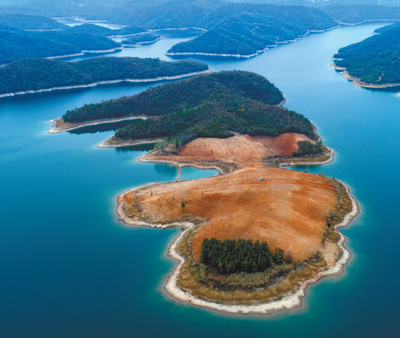 “看!”船行约30分钟后,绕过几座小山,顺着何伯(化名)指着的方向,抬眼望去,一座黄土裸露的湖心岛,与周围青山绿水形成了鲜明对比。