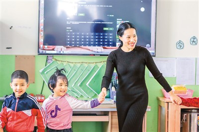 12月9日,新疆阿克苏市富阳幼儿园里,杭州援疆教师何露露在和孩子们做游戏。俞刘东摄(人民图片)
