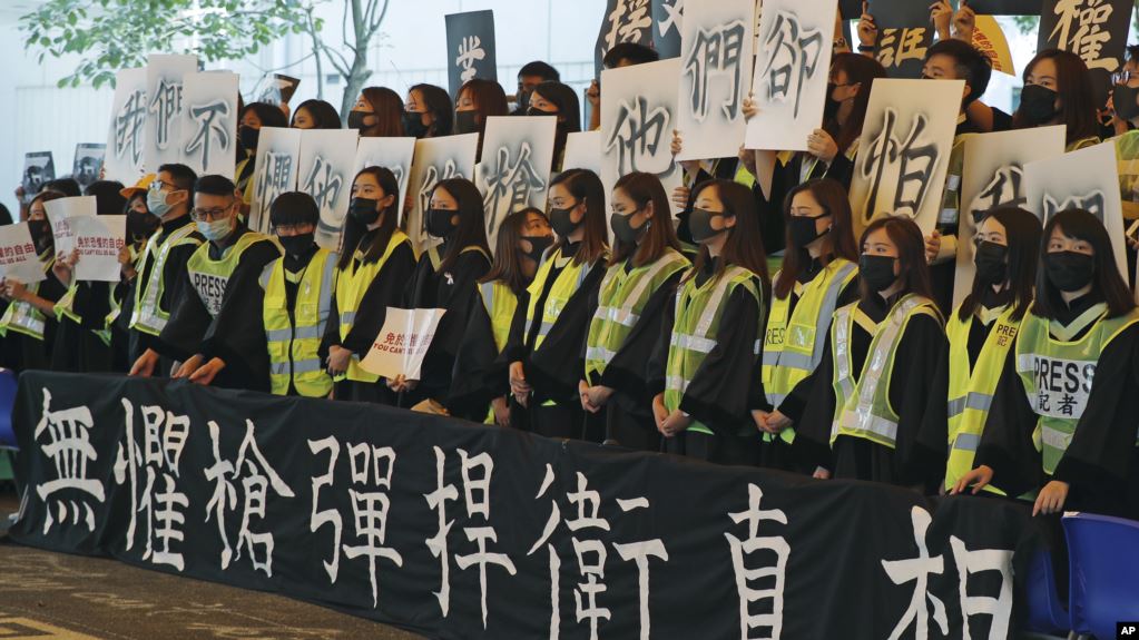 大批香港中文大学的毕业生在星期四(11月7日)毕业典礼时不顾当局禁令戴口罩抗议,并高举“光复香港,时代革命”等标语横幅。