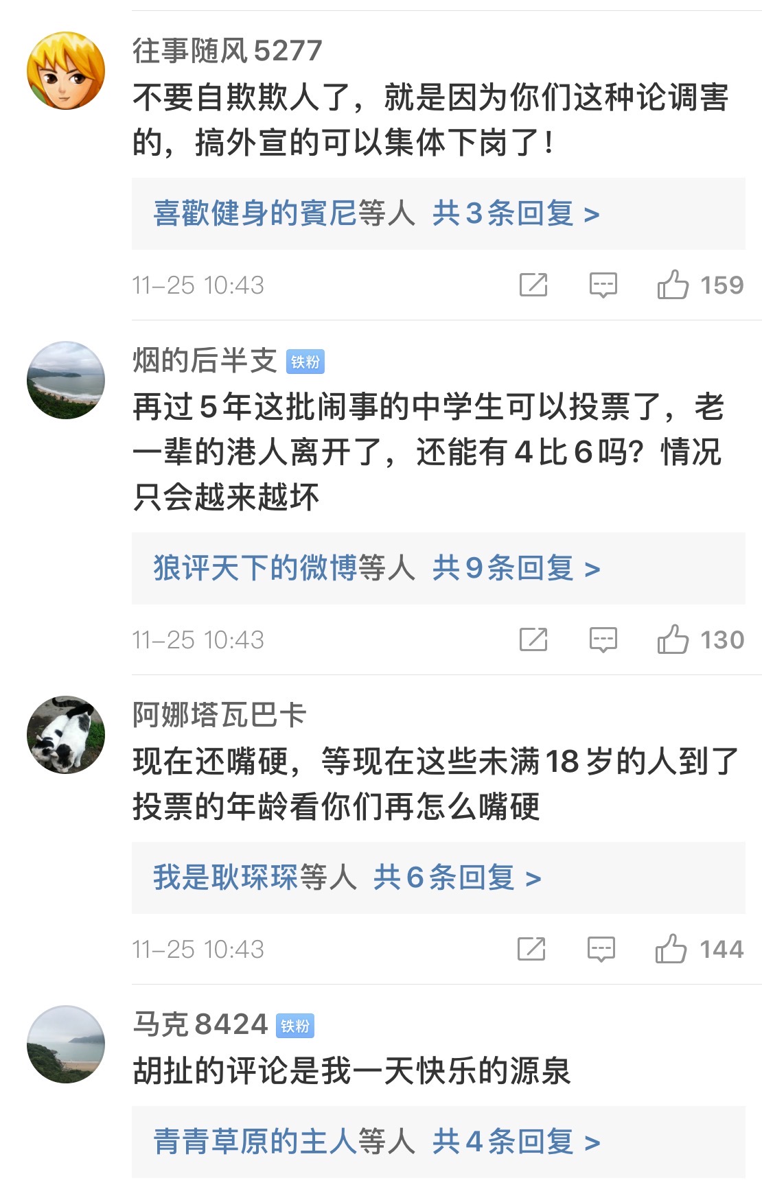 香港的多数人支持暴力,支持在香港形成指向国家的政治对抗,支持香港变成美国一些政治势力向中国施压的桥头堡,这些都是不可思议的,也是完全不可能的。因为这将严重损害大家的利益,将香港推入巨大的不确定性中。冷静看待这次香港区议会选举的结果十分重要,要防止对它的误读使暴徒们受到鼓舞。