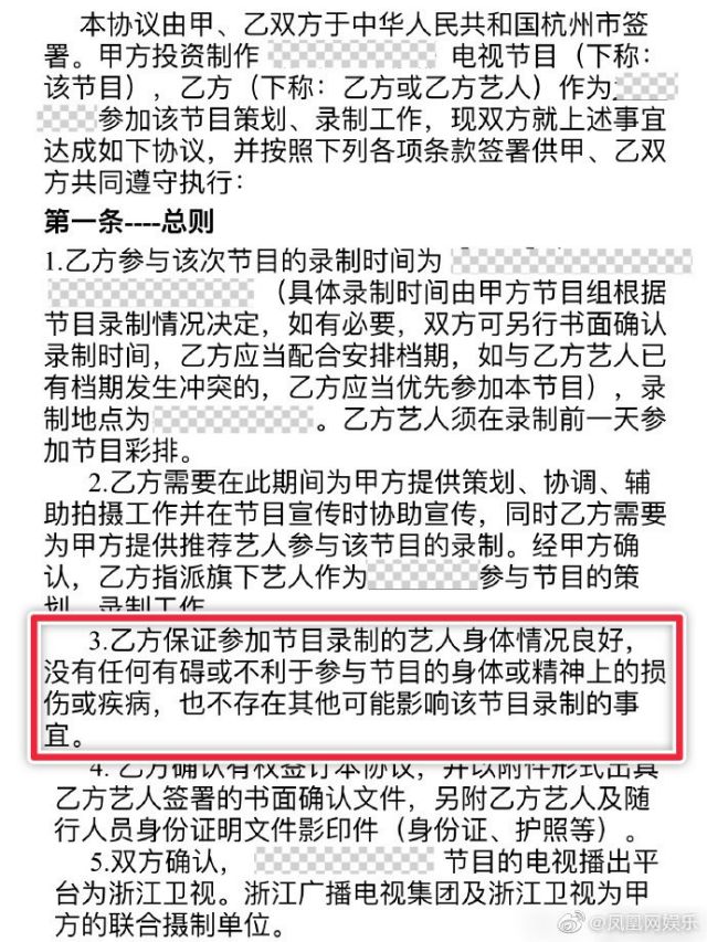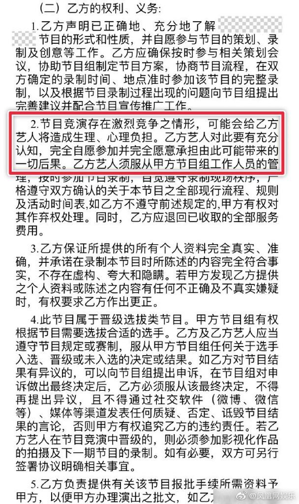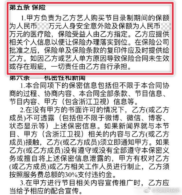 根据《凤凰网娱乐》报导,有网友爆料曝光浙江卫视同类节目与艺人签订的合同,合同中明确指出节目中有激烈竞争的状况,可能会带给乙方艺人身心理上的负担。而乙方艺人对此要有通分认知,“完全自愿”参与并完全愿意承担可能带来的一切后果。惊人的是,网友更指出合同中的保险事宜,并没有将安全、保卫、医疗等相关条款写明确。