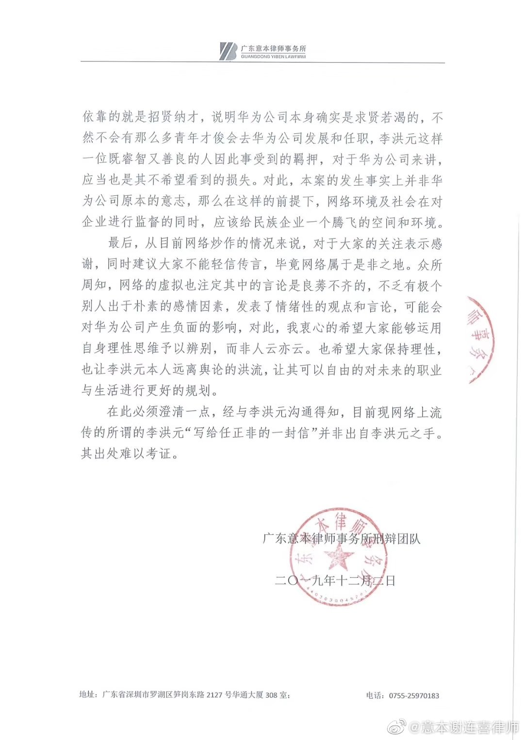 华为星期一发表声明称:“华为有权利,也有义务,并基于事实对于涉嫌违法的行为向司法机关举报。我们尊重司法机关,包括公安、检察院和法院的决定。如果李洪元认为他的权益受到了损害,我们支持他运用法律武器维护自己的权益,包括起诉华为。这也体现了法律面前人人平等的法治精神。”