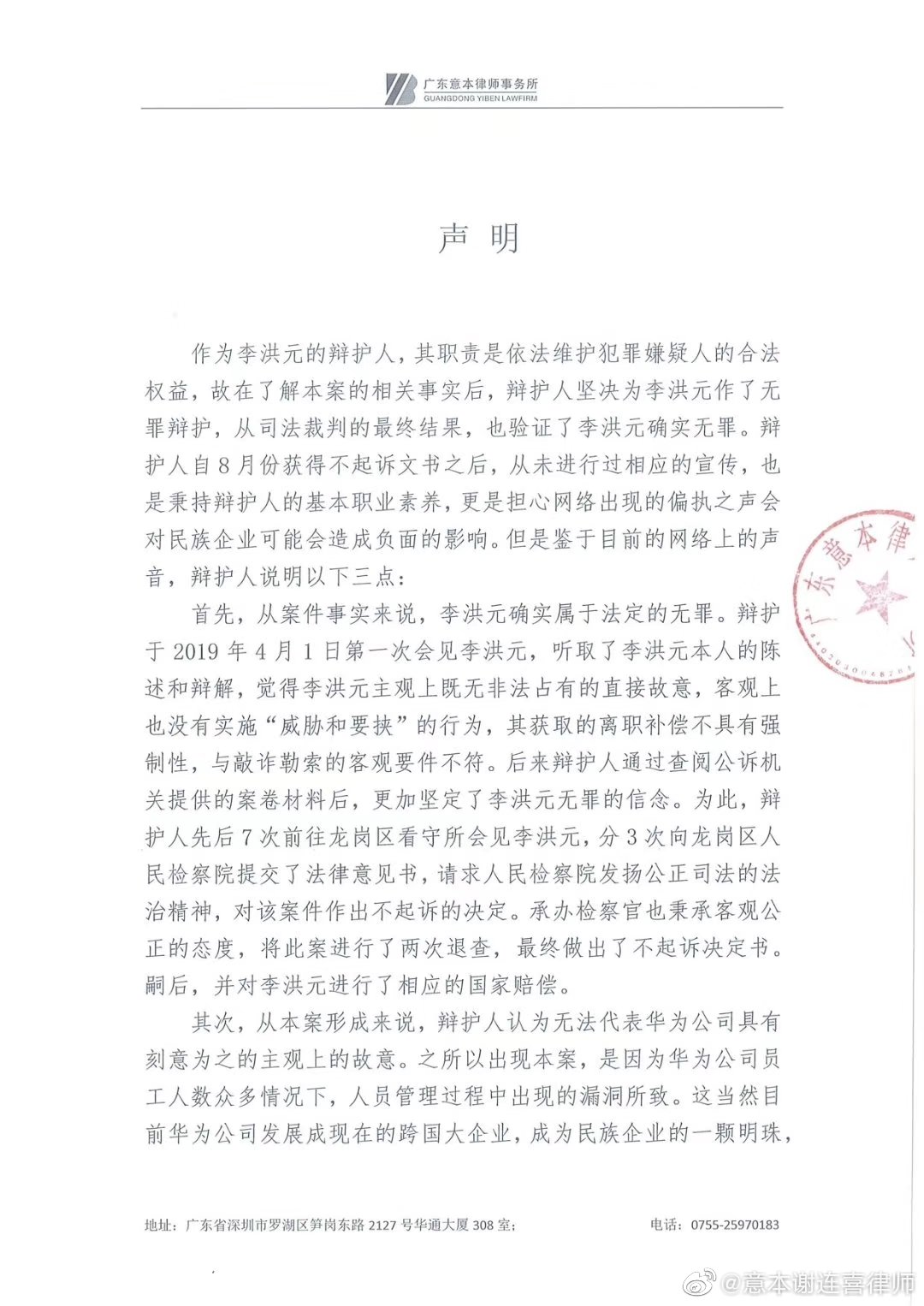 李洪元辩护律师对本次事件发表声明称, 第一,本次案件的不起诉决定本身证明了我国目前法治建设的进步,为保护我国公民的合法权益,我国的司法机关不会因为报案人的社会地位以及经济实力进行评判,而是坚决以事实为依据,以法律为准绳进行公正的司法。第二,不需要因为本次事件就对我们的民族产业进行道德上的攻击,任何企业都在成长,都会出现不尽人意之处,关注、监督是好的方式,以偏概全的攻击则应禁止。第三,辩护人在办理案件过程中也是坚决以事实为依据,以法律为准绳去对案件进行细致分析、客观评判、大胆假设、小心求证的发表法律意见,这也是得益于深圳良好的司法环境以及深圳律协对刑事律师的支持与保护。