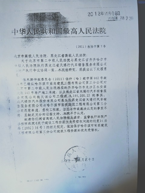 路波提供给本报记者的文件中显示,2011年9月30日最高人民法院作出回函,在这份编号为(2011)执协字第7号的回函中,最高院明确指出,佳木斯仲裁委员会2010年作出仲裁,确认南岗建三公司对北京二院拍卖的齐齐哈尔市龙沙区永安南大街165号房产施工承建,并确认黑龙江天博拖欠南岗建三公司工程款8195500.22元。该回函指出,虽然北汽福田汽车股份有限公司主张黑龙江天博与南岗建三公司恶意串通、虚构工程款,但该主张与佳木斯仲裁委员会仲裁决议认定的事实不符合,且缺乏充分的证据支持,所以,最高院对北汽福田的主张不予认定。