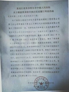 裁决生效后,南岗建三公司依法向齐齐哈尔市中级人民法院(以下简称齐齐哈尔中院)申请执行。路波说,“本来以为通过法律程序把我们建的4S店拍卖后,我们就能拿到公司的血汗钱。