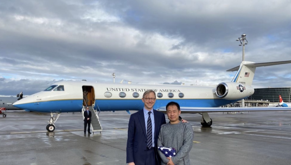 王夕越乘坐瑞士政府的飞机从德黑兰飞往苏黎世,之后前往美军在德国的拉姆施泰因基地接受体检后飞回美国。