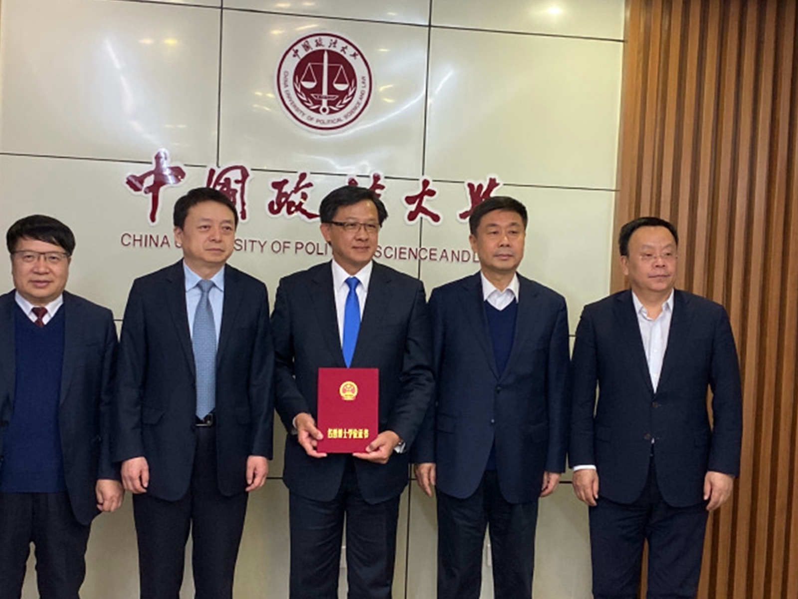 何君尧(中)与中国政法大学相关负责人的合影。何君尧获得中国政法大学名誉博士学位。(微博@何君堯JuniusHo )
