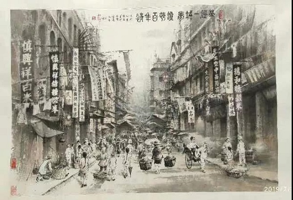 國画,150X90cm〈華燈一城夢,漁村百年情〉