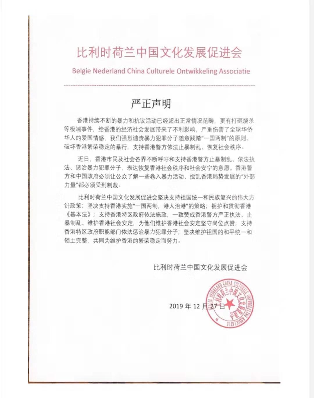 【支持港警执法 严惩暴徒】比利时荷兰中国文化发展促进会 严正声明!