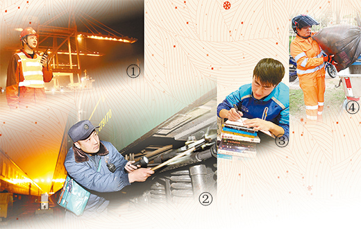 图①:夜里12点,施旺金在码头工作。 本报记者 张云河摄 图②:王振波在检修列车。 赵 庆摄 图③:郭杜军在写新年愿望。 本报记者 魏 薇摄 图④:吴丽强在收集垃圾袋。 本报记者 朱荣鹏摄
