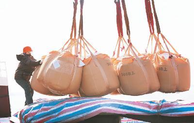 工人在江苏南通港港口装运出口化肥。(人民图片)