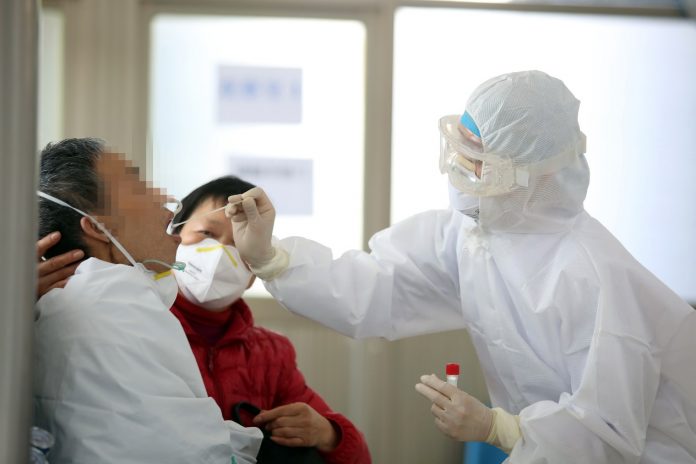 Face à l’épidémie de pneumonie due à une nouvelle infection à coronavirus, lors de la Fête du Printemps, le 1er Hôpital du Peuple de Changzhou, dans la province du Jiangsu (est de la Chine), a ouvert un service de traitement de la fièvre fonctionnant 24h/24 pour faire face à la ligne de front du virus et lutter contre l’épidémie. L’hôpital a mis en place une équipe d’urgence professionnelle, créé de manière indépendante des zones de diagnostic et de traitement de la fièvre, établi un service d’isolement spécial, effectué des diagnostics et des traitement à point fixe pour tous les patients atteints de fièvre et effectué une inspection sur place des cas suspects. La photo montre un membre du personnel médical prélevant un échantillon de gorge sur un patient atteint de fièvre, le 2 février. (Chen Ye / pic.people)