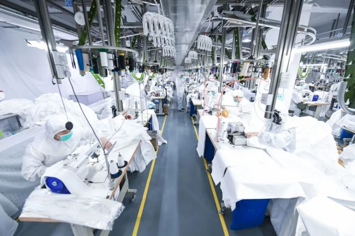 在深圳赢家时尚集团生产车间,工人缝制防护服。新华社记者 毛思倩 摄