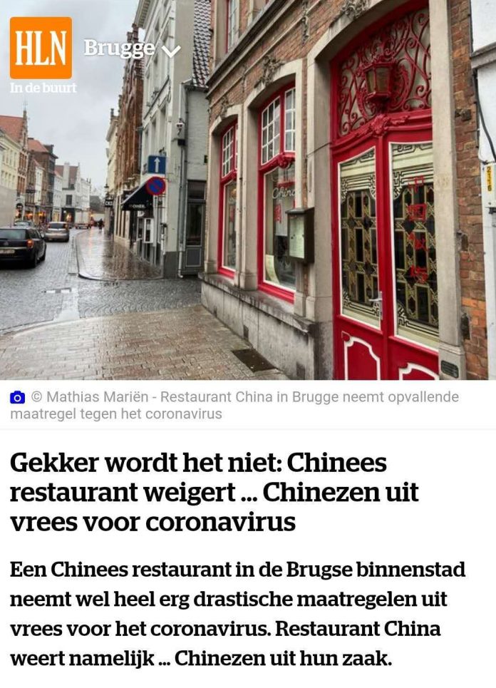 题目就很“耸人听闻”:畏惧病毒:中餐馆拒绝中国客人!。。。。内容大概的意思是,该店主为了避免被感染新冠肺炎,在近段时间不再接待中国游客了,一般情况下,他们会有一些中国旅游团来这里用团餐,店家说:现在还好,是旅游淡季,而且我们70%的客人主要还是当地人,另外,也不是所有的中国客人都拒绝,比利时的华人还是欢迎的。记者问道如何确定是否是中国游客?店主回答:我们一般用荷兰语问答就会知晓了。