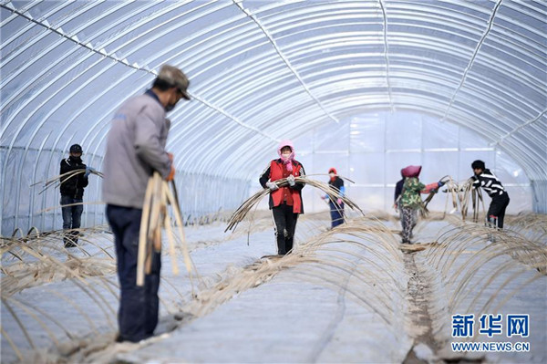 农户在宁夏银川市贺兰县立岗镇兰丰村村集体育苗温室项目打理秧苗。新华社记者 王鹏 摄