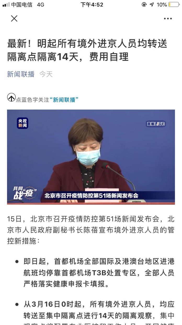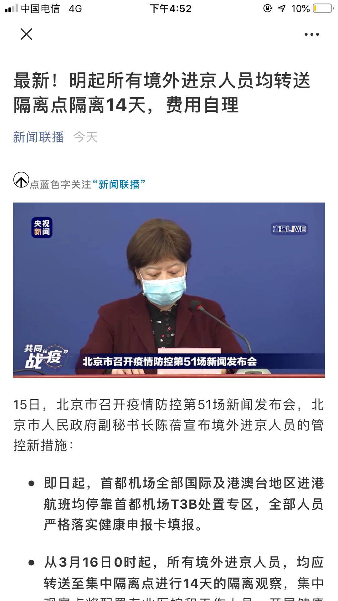 ②从3月16日零时起,所有境外进京人员,均应转送至集中观察点进行14天的隔离观察。有特殊情况的,经严格评估,可进行居家观察。集中隔离观察期间,隔离人员费用需要自理。