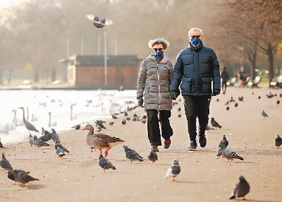 3月31日,在英国伦敦海德公园,人们戴着口罩散步。  新华社/法新