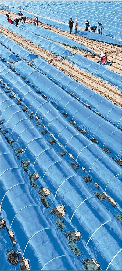 4月1日,河北省唐山市滦南县司各庄镇东南集村,农民为生姜覆盖塑料薄膜。   张永新摄(影像中国)
