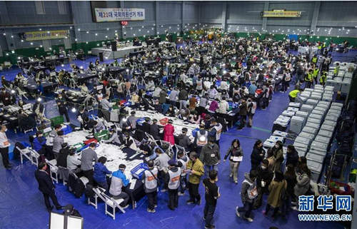 4月15日,在韩国首尔,工作人员在一处计票站内计票。(图片来源:新华社)