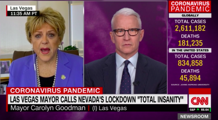 【海外网4月23日|战疫全时区】当地时间22日,美国拉斯维加斯市市长卡罗琳·古德曼(Carolyn Goodman)接受CNN连线,与记者安德森·库珀探讨了一系列关于新冠肺炎疫情的话题。期间,古德曼坚称要重新开放经济,而CNN记者则援引中国研究提出质疑。