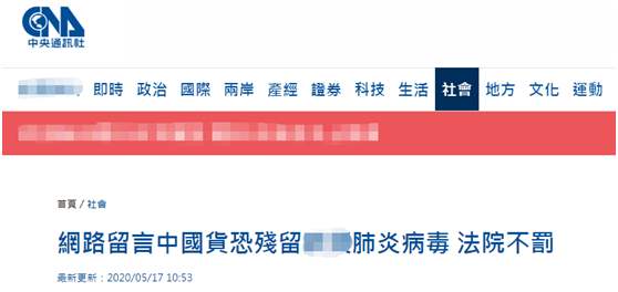 据台媒报道,台湾陈姓网民因此前在网络留言称大陆商品极可能带有新冠肺炎病毒,被警方认定为散布谣言,依相关条例移送法办。但法院审理认为,该留言用意是“提醒避免病毒散播,不是故意散布谣言”,裁定不罚。