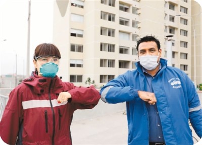 日前,中国援助秘鲁抗疫医疗专家组走访了秘鲁首都利马新冠肺炎临时隔离中心,与当地抗疫一线的医护人员进行经验交流。图为中秘两国专家碰肘致意。  新华社/安第斯通讯社