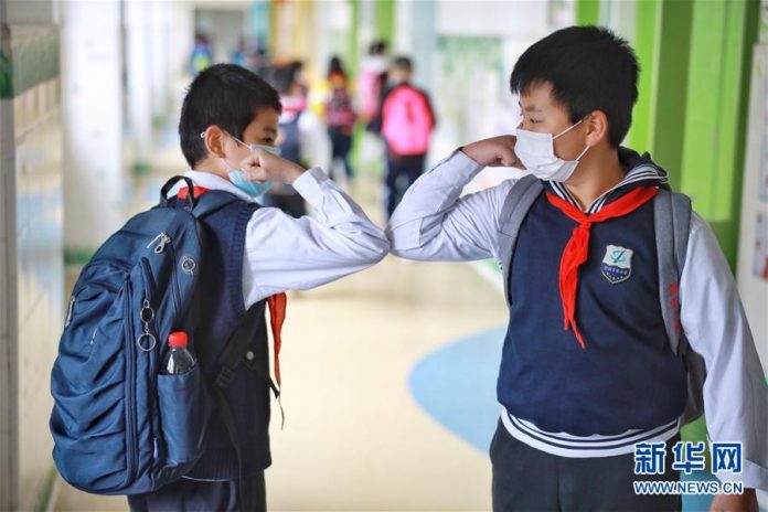 贵州贵阳一小学复课后,两名学生用“碰肘”的方式打招呼。新华社 刘续 摄