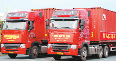 3月25日,西部陆海新通道新开重庆长寿首发铁海联运班列(重庆长寿—广西钦州)集装箱货车在长寿经开区等待发车。货物由集装箱货车运至重庆团结村车站后,登上西部陆海新通道铁海联运班列运往广西钦州,随后发往越南、印度、巴基斯坦等国家。 黄 伟摄(新华社发)