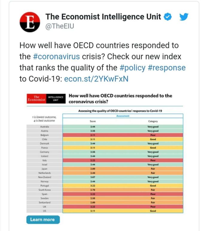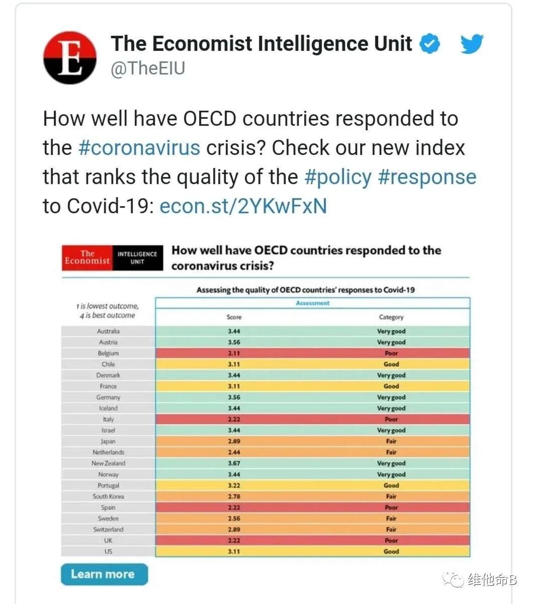 据EIU,“总的来说,这些国家行动得又早又迅速,成功地抑制了疫情的发展。并不是所有的国家都施行了封城,但无一例外,他们的检测力度都很大,并对感染者实行了严密追踪。”