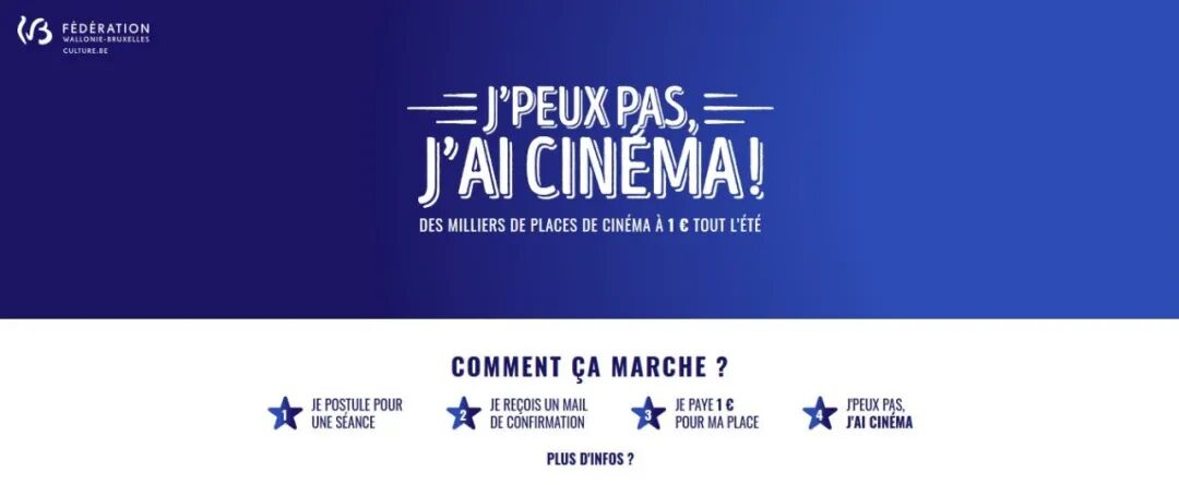 本周一,瓦隆-布鲁塞尔大区电影和电视中心发起了名为“J’peux pas, j’ai cinéma”的活动,将有15000张电影票以一欧的价格在jaicinema.be网站上面向公众出售。
