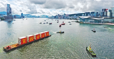 7月1日,载有“贺国安立法”标语的船只从香港维多利亚港驶过。 新华社记者 吕小炜摄