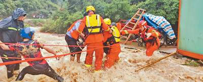 7月4日上午,受强降雨影响,江西九江金鸡坡油库低洼地带发生内涝。当地消防救援人员采取“背、抱”的方式,将16名被困群众转移至安全地带。 王 巍摄(人民视觉)