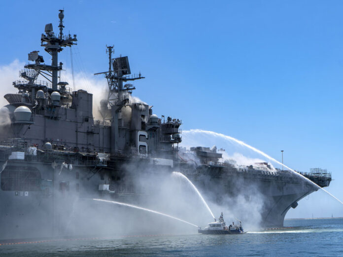 停泊在加利福尼亚州圣迭戈海军基地的美军“理查德号”两栖攻击舰12日发生火灾,大火目前仍在持续燃烧。综合美国广播公司(ABC)、美国全国公共广播电台(NPR)报道,到目前为止共有至少57人受伤。(来源:海外网)