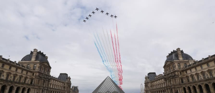 7月14日,“法兰西巡逻兵”飞行表演队飞过法国巴黎卢浮宫玻璃金字塔广场。法国一年一度的国庆阅兵式14日在巴黎举行。受疫情影响,法国总统马克龙没有在香榭丽舍大街举行国庆阅兵式,而是在协和广场举行小型庆祝仪式,向在抗疫斗争中做出贡献的公民致敬。(来源:新华社)