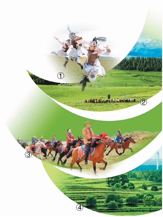 图片说明:①7月3日,敖包文化节在内蒙古乌兰察布辉腾锡勒黄花沟草原旅游区举行。图为演员在表演蒙古族舞蹈。王正摄(人民视觉)②新疆天山草原。徐树春摄 ③6月24日,在甘肃肃南裕固族自治县康乐镇康丰村,裕固族牧民正在草原上进行赛马。申翌晓摄(人民视觉)④夏日,河北张家口坝上绿意融融。陈晓东摄(人民视觉)