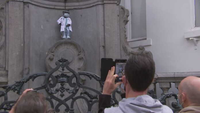 布鲁塞尔市的撒尿小童于连(雕像)本周六穿上了医护人员的服装,向Iris Network公立医院的工作人员致敬。