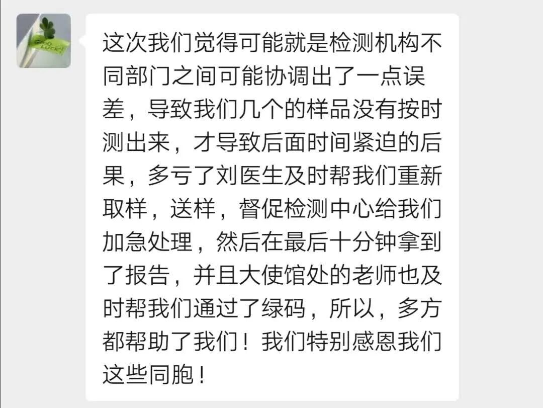 小编这里特别提醒有回国计划或者已经订了机票,正在联系预约检测时间的朋友,一定要做好“预备案”,找对检测机构很关键,提前“做功课”打电话发邮件询问所需个人材料及步骤和一旦出现问题的补救方法。否则,就像本文中的五位同学,如果没有刘医生的热心帮助,只要稍微出现一点点偏差,可能回国的脚步就会被无情终止,虽然机票可以退还,但在一票难求的大背景下(加之高昂的价格),这样的损失还是要尽量避免。