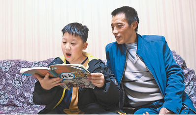 冉光辉在家里听儿子冉俊超朗诵课文(资料照片)。 新华社记者 王全超摄