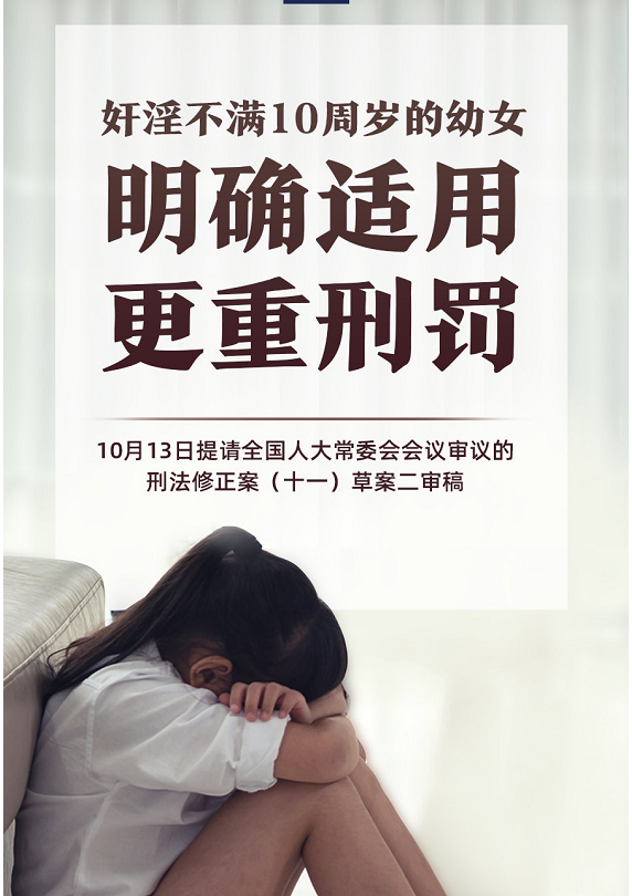 今天,刑法修正案(十一)草案二审稿提请全国人大常委会审议,加强对未成年人的刑法保护。①修改奸淫幼女犯罪,对奸淫不满十周岁的幼女或者造成幼女伤害等严重情形明确适用更重刑罚。②增加特殊职责人员性侵犯罪,对负有监护、收养、看护、教育、医疗等特殊职责人员,与已满十四周岁不满十六周岁未成年女性发生性关系的,不论未成年人是否同意,都应追究刑事责任。③修改猥亵儿童罪,进一步明确对猥亵儿童罪适用更重刑罚的具体情形。(来源:央视新闻客户端)