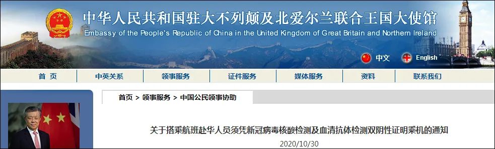 此外,考虑到很多中转机场不具备检测条件,为避免发生中转地滞留现象,降低旅途感染风险,使馆建议自英国赴华人员在英国检测后乘坐直航航班赴华。自2020年11月7日起,中国驻英国使馆和中国驻曼彻斯特、爱丁堡、贝尔法斯特总领馆原则上不再受理经第三国中转赴华乘客的核酸码或健康状况声明书申请。