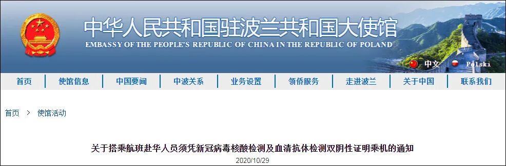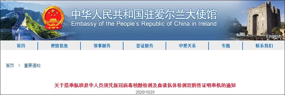 (转自观察者网)随着北半球天气变冷,全球新冠疫情形势迅速变化,从29日起,中国驻美国、法国、英国、爱尔兰、意大利、波兰等多个国家的大使馆网站陆续发布了《关于搭乘航班赴华人员须凭新冠病毒核酸检测和血清抗体检测双阴性证明登机的通知》。在此之前,赴华人员须凭新冠病毒核酸检测阴性证明登机。