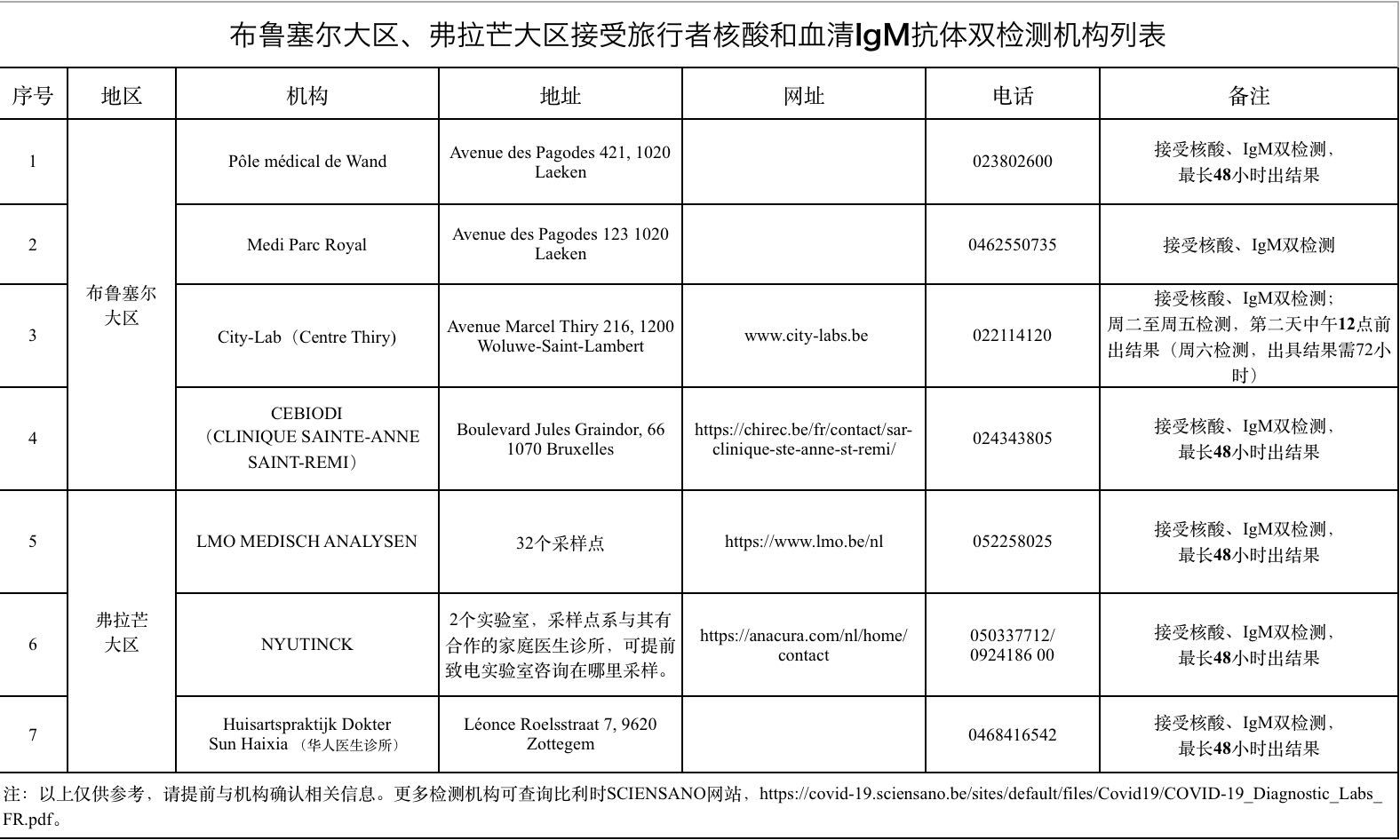 (本平台消息)这是目前经联系确认的布鲁塞尔大区、弗拉芒大区可接受旅行者核酸与血清IgM抗体双检测的机构和实验室,仅供参考,如有需要,请提前与相关机构确认相关信息。