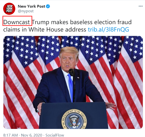 当地时间5日,美国总统特朗普在选举夜后首次公开露面并发表讲话。讲话中,特朗普抱怨起了这场大选,指责民主党“偷窃选票”,并称大选中存在“鬼把戏”。值得注意的是,在有关这场讲话的报道中,《纽约邮报》却用了一个极为罕见的词来形容特朗普当天的状态——Downcast(沮丧的)。
