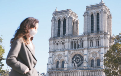 法国国民议会11月7日投票通过了延长“卫生紧急状态”的法案,“卫生紧急状态”将延长至2021年2月16日。图为11月9日,在法国巴黎,一名女子从修复中的巴黎圣母院附近经过。  新华社记者 高 静摄