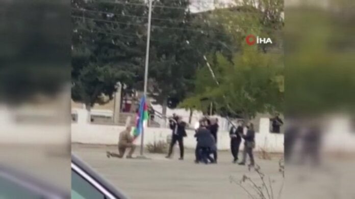海外网11月17日电 据土耳其tv100电视台报道,当地时间16日,阿塞拜疆总统阿利耶夫携第一夫人,亲自驾车前往从亚美尼亚收回的纳卡地区,并在媒体记者前,跪地亲吻国旗后将其升起。