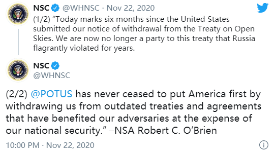 据俄罗斯卫星通讯社报道,白宫国家安全委员会在推特上表示:“今天距离美国提交退出《开放天空条约》的通知已经过去6个月。我们不再是这一条约的成员。”该委员会称,俄罗斯多年来“一直违反这一条约”。